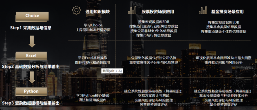 Python金融数据分析、Choice金融终端实务操作、Excel 数据处理与分析。