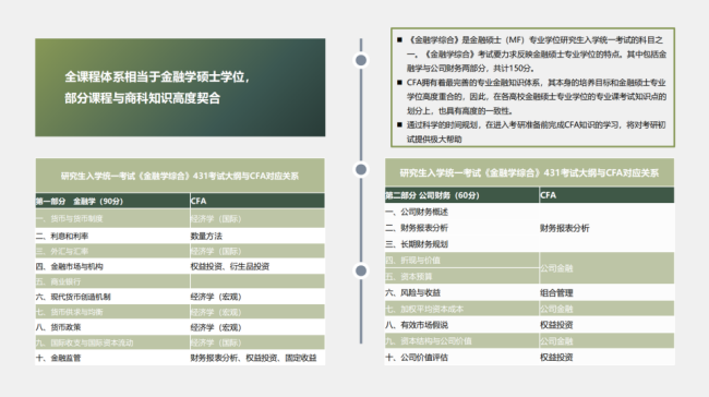 ②国内多所知名院校的财经金融类研究生课程依照CFA的考纲而设计,专业课作为提分的重点科目,财经人才培养计划通过教学,让同学缩短考研备考周期。学员的考研专业课将成为强项。