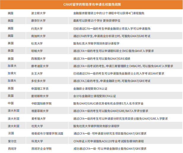 国外商科名校(例如波士顿大学,康奈尔大学,伦敦商公司,多伦多大学等)的商公司在申请职工时,阶段性通过CFA考试可豁免GMAT的成绩要求,部分公司可获得课程豁免。