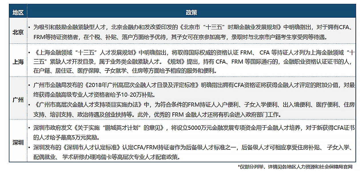 为引进和培育财经金融领军人才、财经金融高级管理人才和财经金融高级专业人才(主要以CFA&FRM持证人为评定标准),国内已有20多个省市制定专属财经金融人才发展战略,以打造财经金融人才高地。
