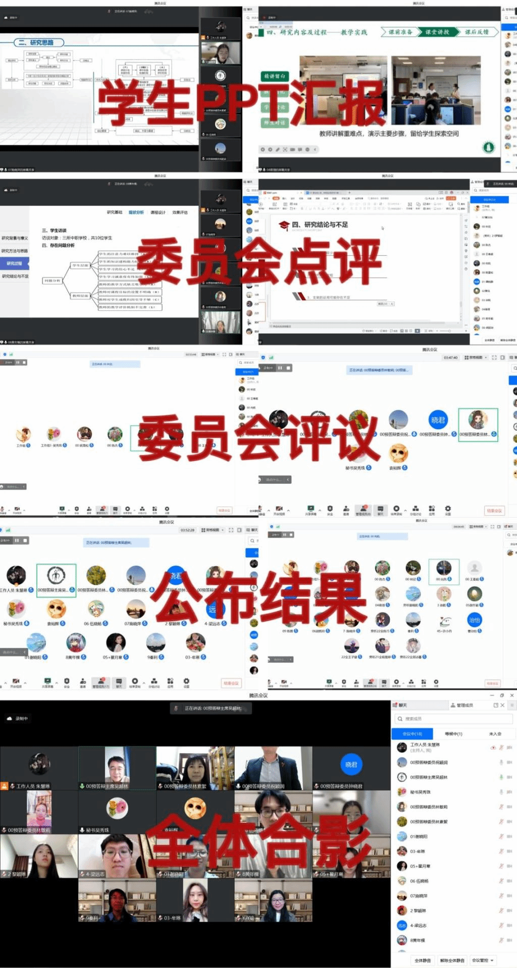 PPT汇报-评委点评”的流程完成后,非预答辩委员会成员移至“等候室”,预答辩委员会则留在“会议室”对预答辩结果进行评议审定,最终一致确定19位同学为“通过”预答辩并随即在腾讯会议室公布,并对所有通过此次预答辩的同学表示祝贺,同时提示各位同学本次预答辩只是修改的开始,论文仍存在许多不足之处,要求各位同学需要根据预答辩委员给出的论文修改建议继续与导师保持沟通,在送审之前认真修改完善论文。