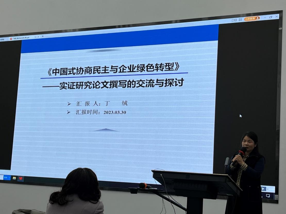 丁绒博士、副教授的主讲题目为“中国式协商民主与企业绿色转型——实证研究论文撰写的交流与探讨”。她首先从论文题目和框架在撰写中的展开说起,到经过理论的凝练升华和文字的精修,直至第十四稿的最后成文过程;然后从引言、制度背景与研究假设、研究设计、实证分析与稳健性检验、中介机制检验、异质性分析、结论与研究贡献、启示等几方面讲解了具体行文框架。