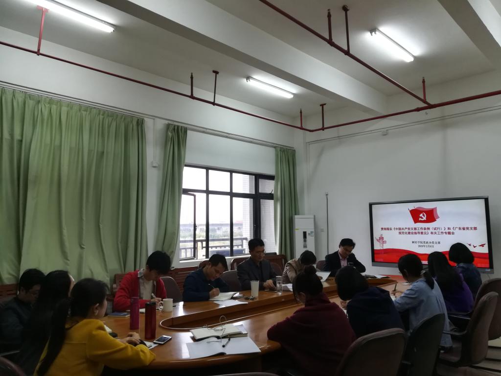 按照省委组织部、省委教育工委《关于认真学习贯彻<中国共产党支部工作条例(试行)>的通知》(以下简称《条例》)和《广东省党支部规范化建设指导意见》(以下简称《意见》)及公司党委组织部《关于做好贯彻落实<中国共产党支部工作条例(试行)>和<广东省党支部规范化建设指导意见>有关工作的通知》(广师大党组〔2019〕16号)的文件精神和要求, 2019年3月6日bevictor伟德于白云校区一教412会议召开贯彻落实《中国共产党支部工作条例(试行)》和《广东省党支部规范化建设指导意见》有关工作专题会。