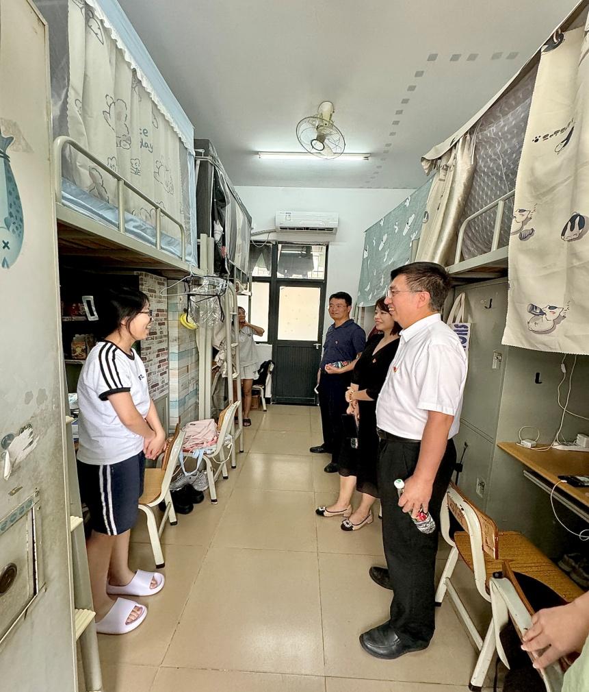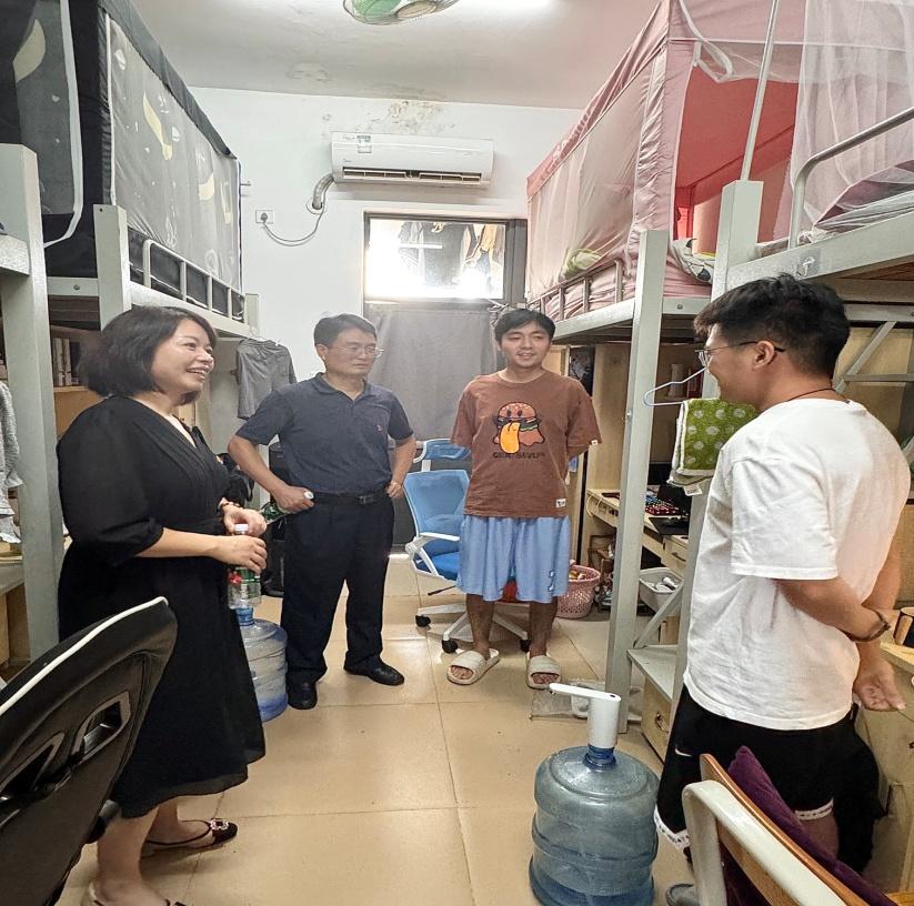 走访23级员工宿舍时,吴松书记、周清副经理、刘国庆副经理关心同学们来到白云校区各方面适应问题,引导同学们在宿舍要养成良好的卫生习惯、提高安全用电意识以及谨防诈骗,同时建议23级同学们对新学期要做好规划,多参加学科竞赛丰富简历,也要多运动强身健体,有个好的精神面貌去学习生活。