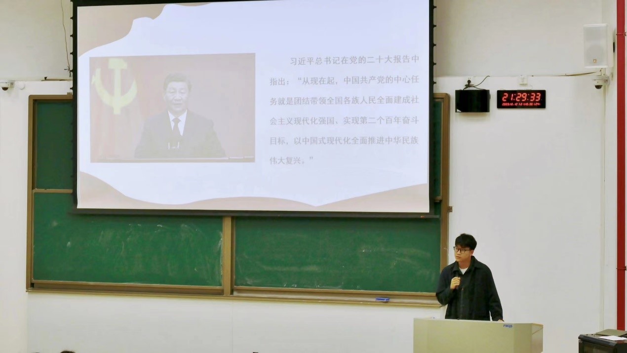 会上,陈逸珺老师以中国共产党第二十次全国代表大会召开的背景与大会的主题作为学习会的切入点,结合党的二十大报告内容为同学们讲解了中国式现代化及其五大特征、首要任务、两个永远在路上、两步走战略、三大支撑、三个务必、五个必由之路、五个重要原则等党的二十大精神要点,引领大家深入学习贯彻党的二十大精神。