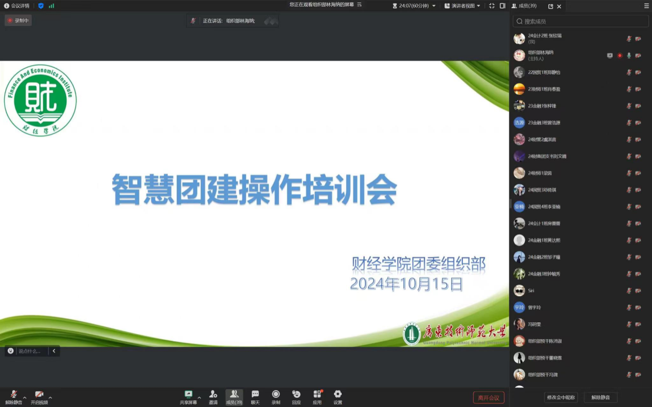 本次会议共包含七个部分。围绕着智慧团建的基本操作和各团支书日常行为规范指导展 开。会议的第一至 第四部分聚焦于智慧团建操作的流程及注意事项。其中,组织部详细地阐述了如何设置智慧团建团干与运营者、如何使用智慧团建移动端以及如何利用智慧团建平台进行团组织关系转接等操作,本次讲解详细透彻,使各班团支书全面了解智慧团建平台的操作细节;会议的第五部分是关于教育实践专题录入的操作流程,在这一部分重点强调了开展教育实践专题活动的相关要求,意在有效落实团日活动;第六部分和第七部分则对“团支部换届”、“审核修改资料”和“团费缴纳”的操作方法进行了详尽的解释,并重点跟各位团支书强调,每个月需按时缴纳团费,并向组织汇报团费缴纳情况。