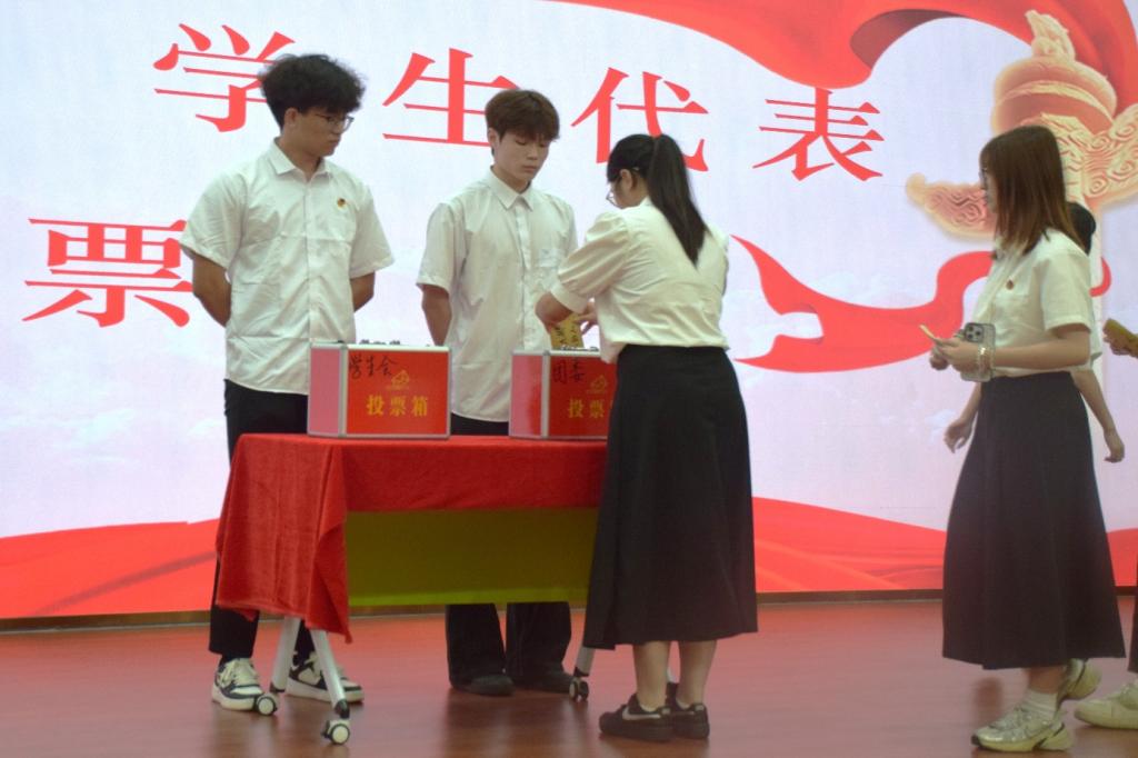 预备会议阶段,主持人曹诗韵严谨宣读大会议程,随后总监票人虞淇茵宣读候选人选举办法。经全体参会人员表决,该选举办法获得一致通过。短暂休会后,大会在雄壮的国歌声中正式开幕,主持人陈思源宣布大会正式开始,全体师生肃立齐唱《义勇军进行曲》,现场气氛庄严热烈。