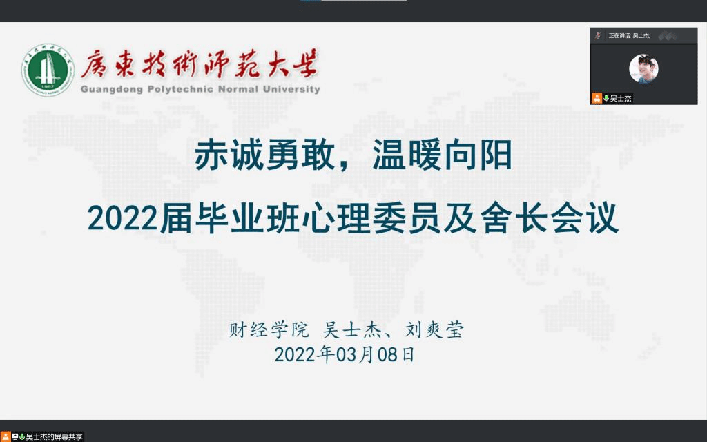 3月8日,公司召开赤诚勇敢、温暖向阳——2018级毕业班心理委员及舍长会议,毕业班辅导员吴士杰、刘爽莹老师参加会议。