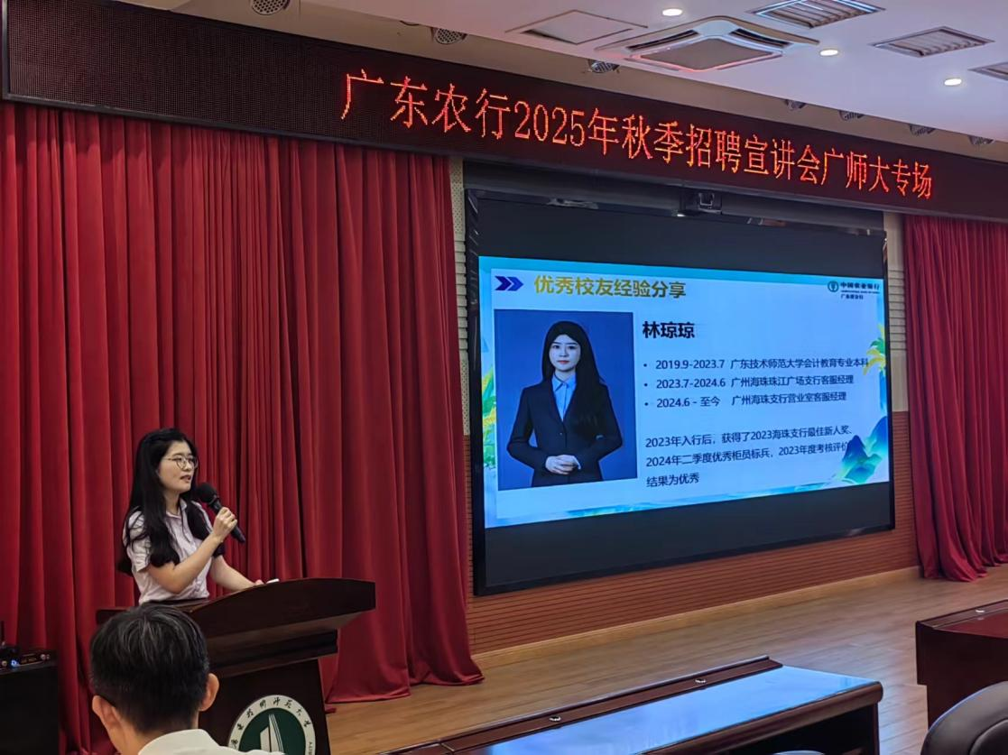 2024年9月19日,中国农业银行广东省分行在公司白云校区举办2025年度校园招聘宣讲会。农业银行广州分行人力资源部高级人力资源管理曹庭恺、人力资源部员工与机构管理王威斯、广州流花西郊支行客服经理岳傲、广州海珠支行营业室客服经理(2023届员工)林琼琼莅聘公司招聘宣讲。宣讲共设置优秀员工分享、企业文化简介、岗位体系解密、提问答疑和现场简历收集等环节。公司党委副书记黄伟文和bevictor伟德副经理刘国庆以及200多位毕业生参加此次宣讲会。