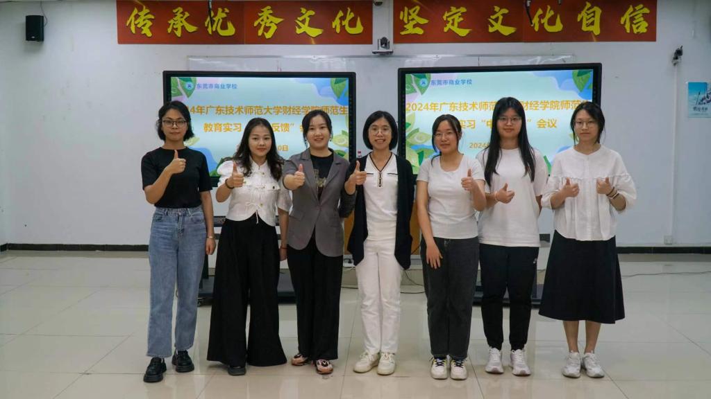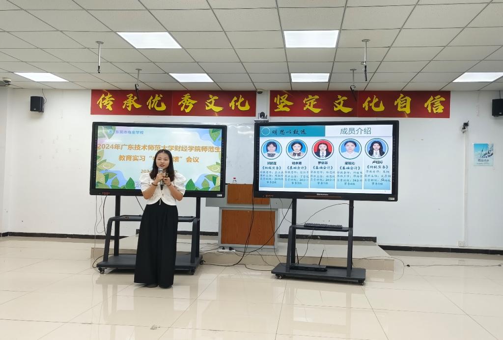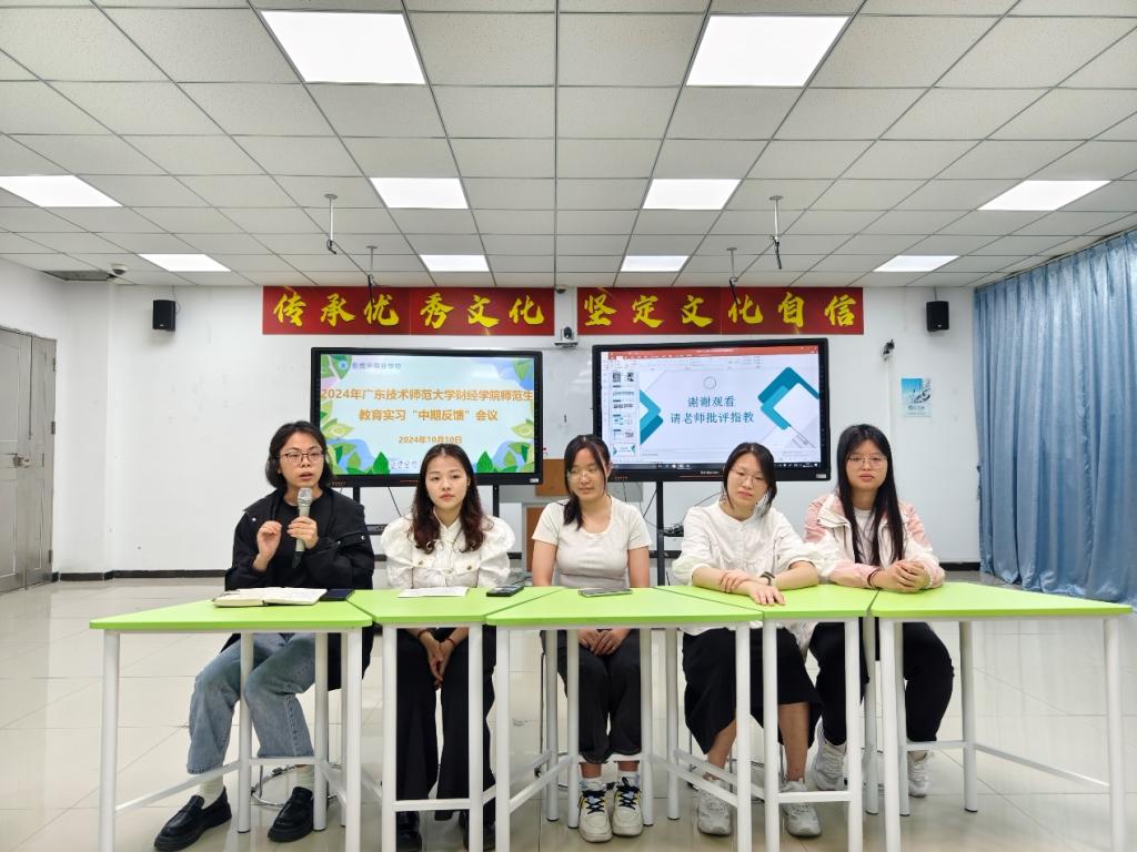 会议第二项议程是实习生轮流发表对本次实习的体会和收获,以实习小组组长钱余晴为首,小组成员郭凯莲、卢钰婷、罗依菲、梁琼沁随后依次发言,从生活感受、备课上课、跟班体会等多个维度讲述了实习生在教学实践中的成长与收获,表达了对众带教老师的感谢以及对本校和东莞市商业公司给予实习机会的感激。