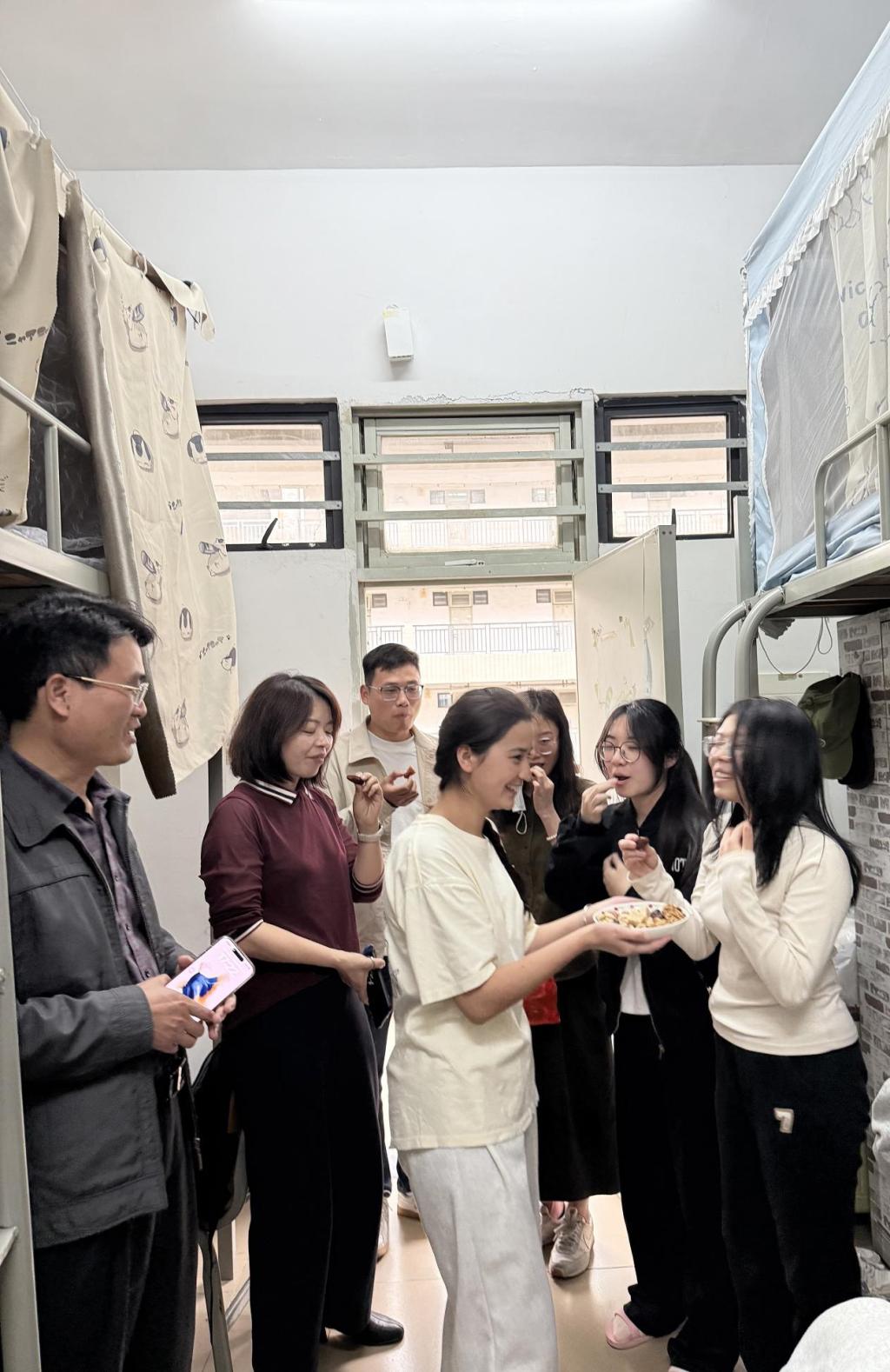 吴松书记与周清副经理带领辅导员走进大二、大三员工宿舍,重点检查用电安全与卫生环境,逐一排查安全隐患,对插线板摆放、大功率电器使用等安全问题提出要求,确保安全无死角。走访过程中,老师们特别来到有少数民族同学的宿舍,她们热情分享家乡带来的特色美食,领导老师关切询问饮食适应情况,强调不同民族同学要互爱互助,共同营造温馨向上的校园生活空间。同时提醒同学们注意防火防盗、谨防电信诈骗,叮嘱春季流感高发期注意个人防护,并鼓励同学们新学期要做好规划,多运动强身健体,以更好的精神面貌迎接新学期的学习生活。