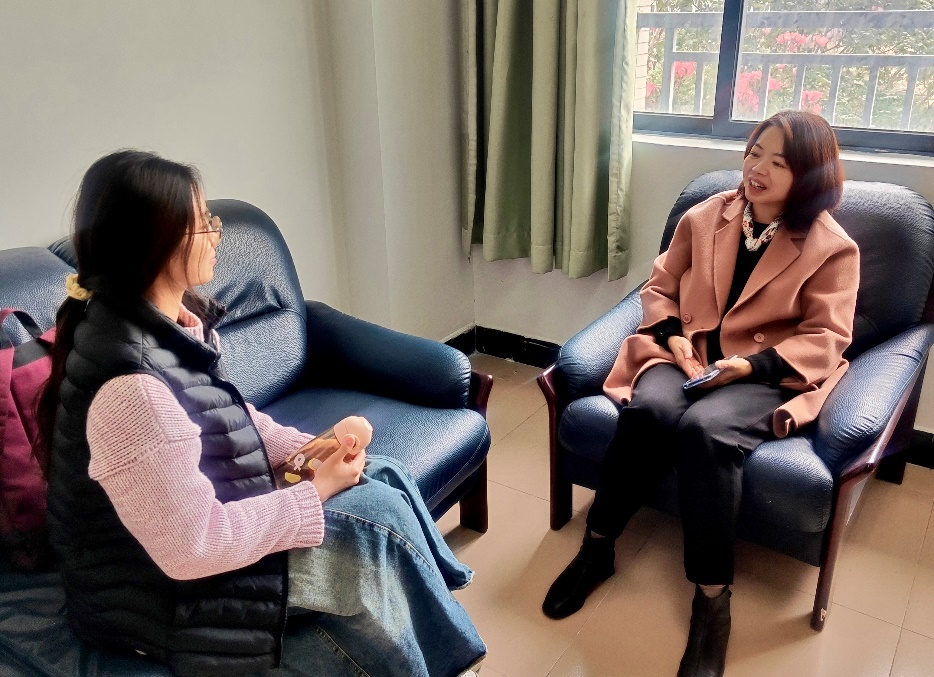 黄伟文副书记与 22 级财管 2 班朱坤杰、22 级会计 3 班何敏婧等同学以日常谈话营造轻松氛围,深入了解班级和个人问题与困惑。副书记凭借多年辅导员的工作经验,针对员工在班级和个人发展中遇到的问题,给出了许多实用的建议。他分享了许多员工从迷茫走向成功的真实案例,鼓励员工们积极参加各类比赛,在实践中锻炼自己,不断提升自我管理和自我提升能力。