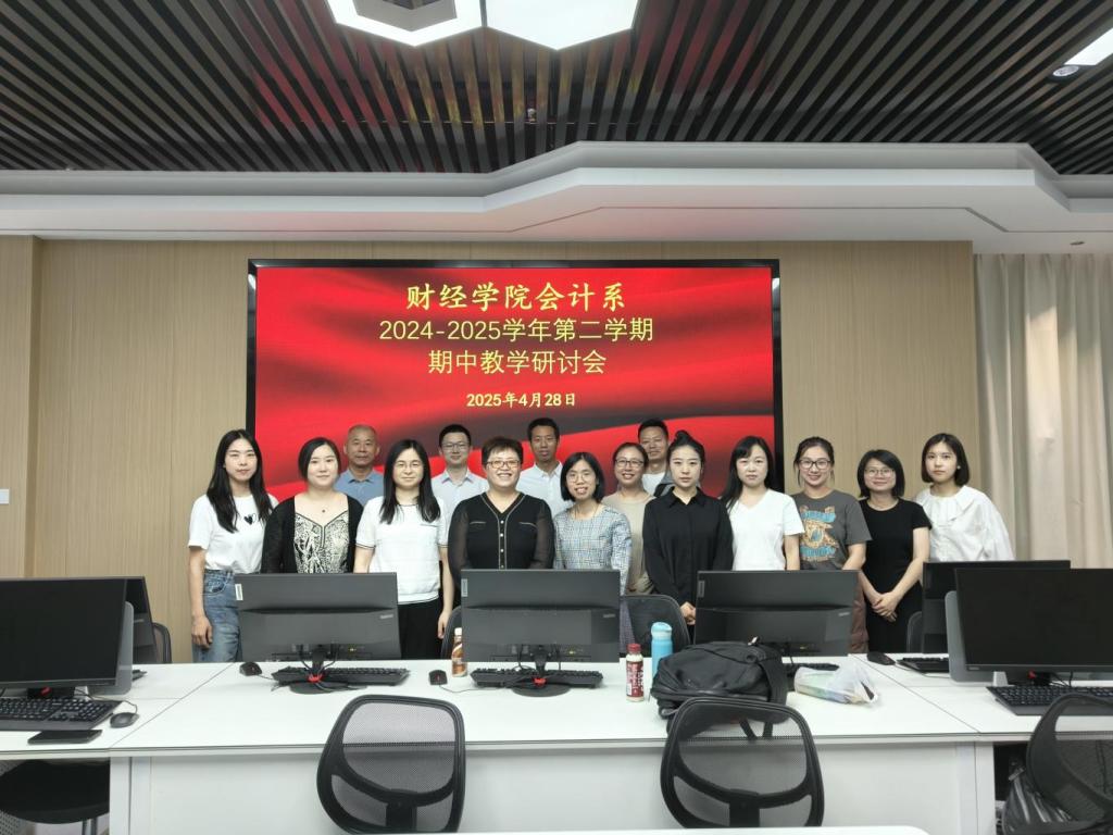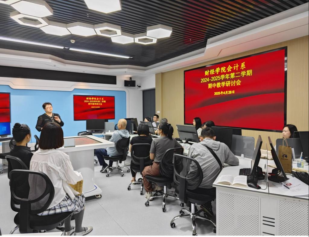 2025年4月28 日中午 13:30,会计系在第三实训楼503召开系教学研讨会。会议首先由蔡军教授首先总结开学初档案检查情况,大部分老师档案规范,分值合理,批改认真。但个别老师个别老师课程目标达成度分析还存在问题。要求老师们要自查整改,将工作做到实处。系副主任曾诗韵老师对毕业论文工作做出安排,并且解答了大家有关实习工作平台员工邦的问题,提醒老师们按时提交定稿与评阅论文。