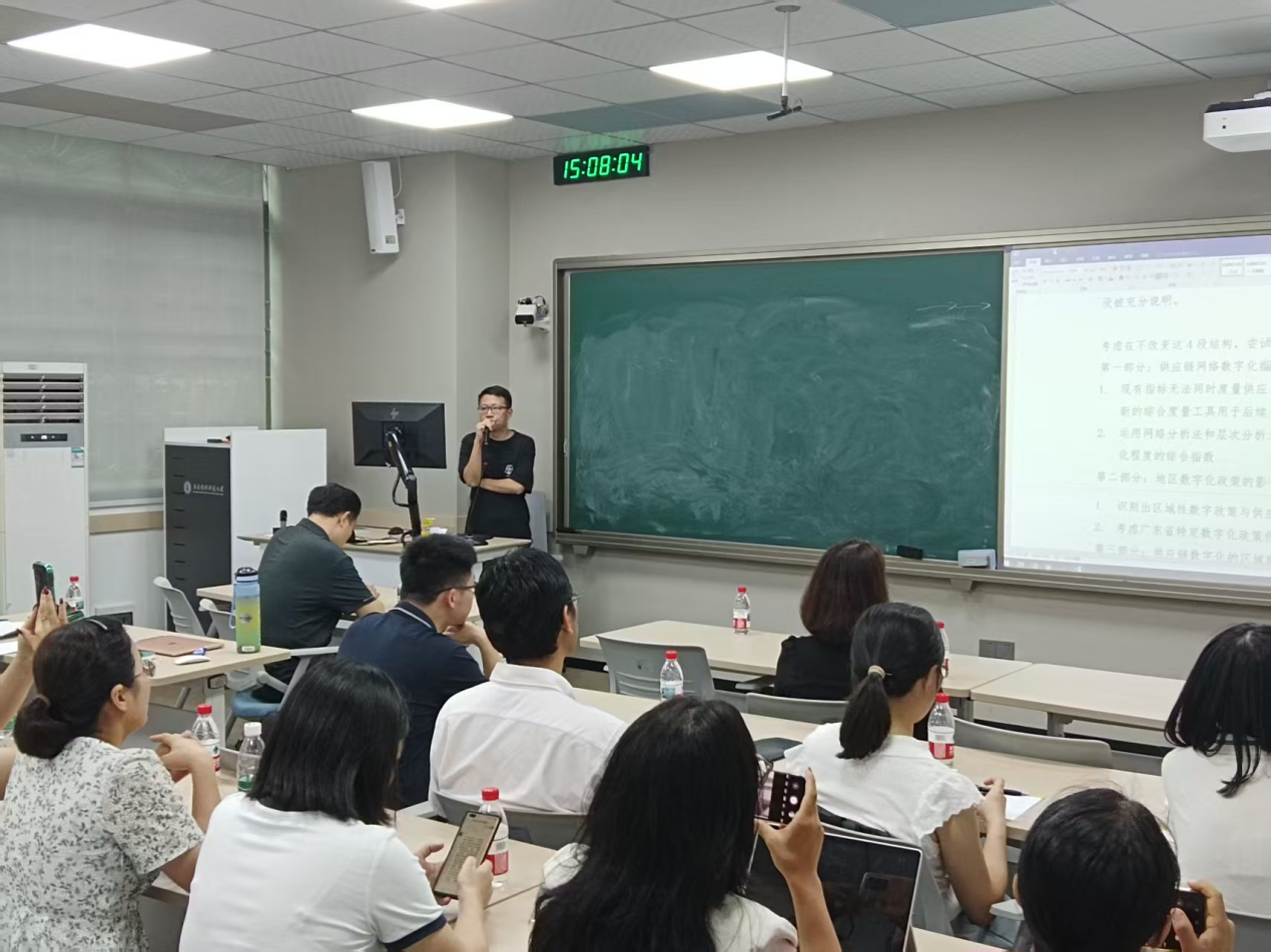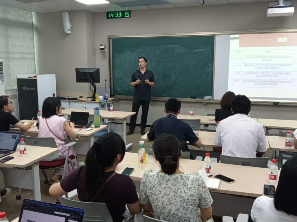 第二位做专题分享的是李伟成老师。李老师的立项题目是《网络视角下广东省供应链数字化转型区域联动机制和政策效应研究》。李老师着重就选题优化以及申报书结构优化进行了反思。选题优化部分,李老师从 “创新性、理论深度、可操作性” 三方面复盘关键词筛选过程,建议通过检索广东省历年立项题目,挖掘高频热点词汇(如 “数字化转型”“区域联动”)。但要注意避免选题过于空泛,需结合区域特色。申报书结构优化部分,李老师讲到文献评述要控制篇幅(约 1 页),段落间需体现逻辑链条。研究内容部分各个章节间要强化逻辑关联。