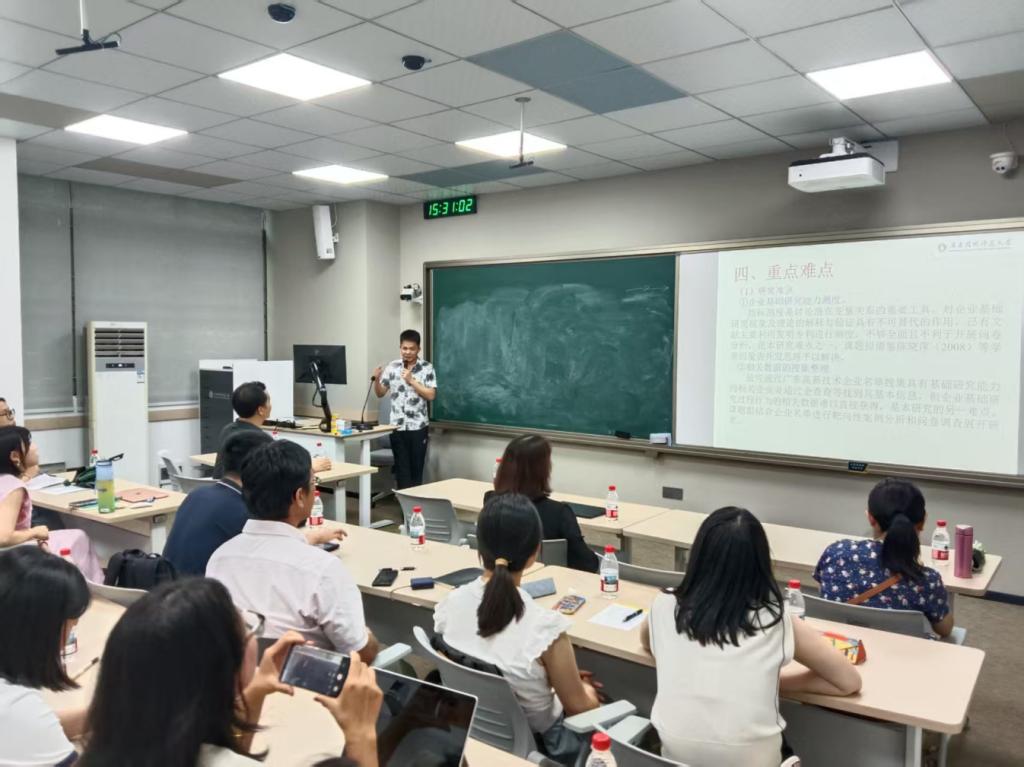第三位做专题分享的是贾建林老师。他的立项题目为《人力资本视角下广东企业基础研究能力提升策略研究》。贾老师从政策与现实结合的选题逻辑进行课题引入,注重可视化论证技巧,在文献综述与研究内容部分融入逻辑框架图,增强论证的直观性与说服力。贾老师得出建议:选题需紧密贴合广东省产业发展规划;严格遵守申报纪律(如字数规定、格式规范);参考同类立项项目的撰写思路,但需突出差异化创新;积极调整心态,特别是申报失败后需结合评审意见反复修改,持续改进与申报。