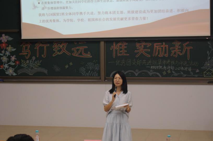 述职汇报展成效,筑基赋能谋新篇。2025年6月3日于博学大讲堂101举办“2024级优秀团支部和先进班集体考核与评选”活动。郑灿玲老师以“三个会”精辟地概括了活动的意义:这是一场经验共享的研讨会、一场比学赶超的大擂台、一场持续优化的反思会。她强调,在大一阶段,应以“四年一盘棋”的长远视角来夯实基础,并对2024级员工提出了三点期望:一是以习近平新时代中国特色社会主义思想筑牢思想根基,二是善于运用AI工具来赋能活动策划,三是强化班委的凝聚力以带动班级的成长。她向全体员工寄语:“让班级成为伴随四年、温暖一生的成长共同体。”