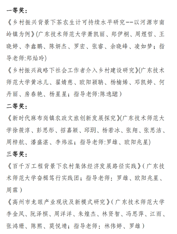 其中,由萧凯丽、郑伊桐等同学组成的团队聚焦茶农生计议题,围绕《乡村振兴背景下茶农生计可持续水平研究——以河源市南岭镇为例》开展实证调研,荣获一等奖。黄冰儿、翟婧慈等同学提交的《乡村振兴战略下社会工作者介入乡村建设研究》同获一等奖,展现公司在社会服务领域的专业深耕与实践探索。徐筱淳等同学的《新时代麻布岗镇农政文旅创新发展探究》获二等奖,《农村集体经济发展路径实践》《高州市龙眼产业现状及新模式研究》两项作品则荣获三等奖。