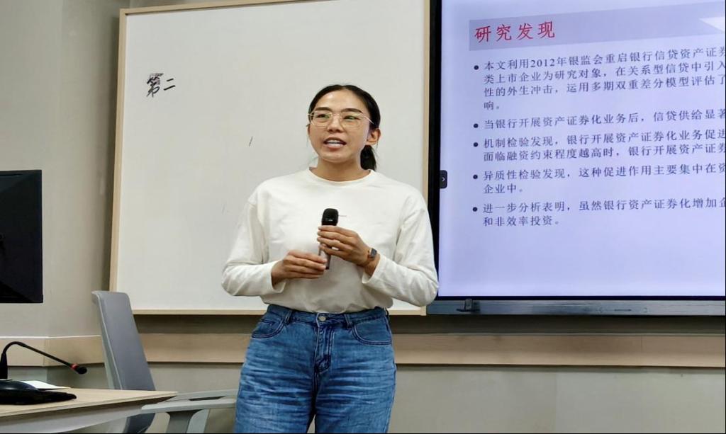 王玥博士作了《银行资产证券化与企业ESG》的论文报告。该研究探讨了银行金融创新如何影响企业ESG,揭示了金融工具在推动绿色经济转型中的杠杆作用,对金融服务实体经济高质量发展具有借鉴意义。