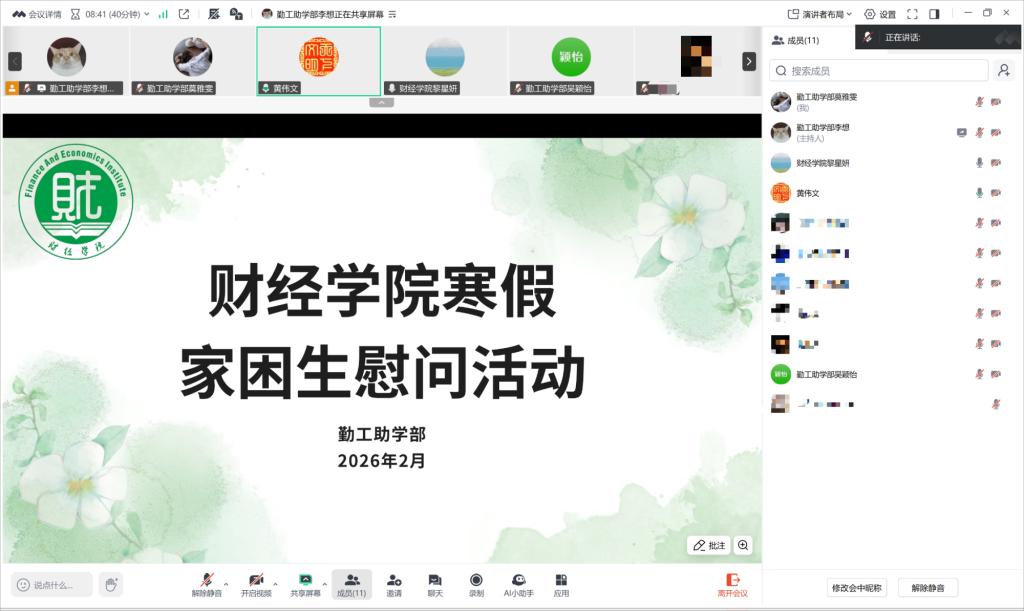 新春将至,暖意先行。为深入践行“资助育人”理念,扎实做好员工助学工作,传递党和国家、公司对家庭经济困难员工的深切关怀,在新春佳节之际,bevictor伟德于2026年2月24日下午开展寒假家庭经济困难员工慰问活动。公司党委副书记黄伟文、辅导员黎星妍通过线上会议的方式,为6名家庭经济困难的员工送上新春的美好祝愿和成长路上的暖心指引。