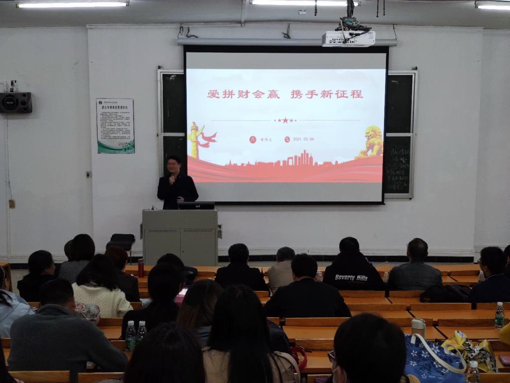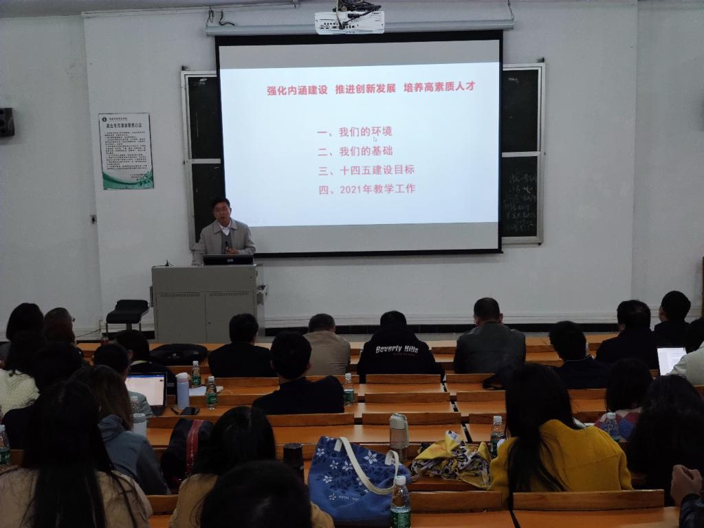 刘国庆汇报新学期第一周教学情况,倡导全体教职工自觉站在新文科建设的背景下,思考和分析充分做好教学工作所面临的机遇和挑战,以员工为中心提升课堂教学效果,将就业帮扶贯穿毕业论文指导,扎实推进2021年教学工作有效落实。